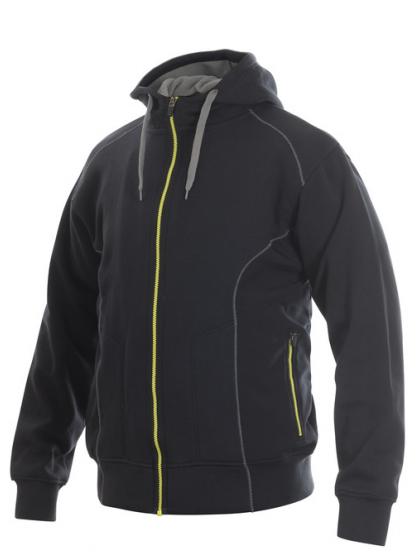 Pracovní mikina s kapucí na zip. Pracovní mikina má softshell výztuhy po stranách a dvě kapsy na zip. Široké manžety na rukávech a kolem pasu.